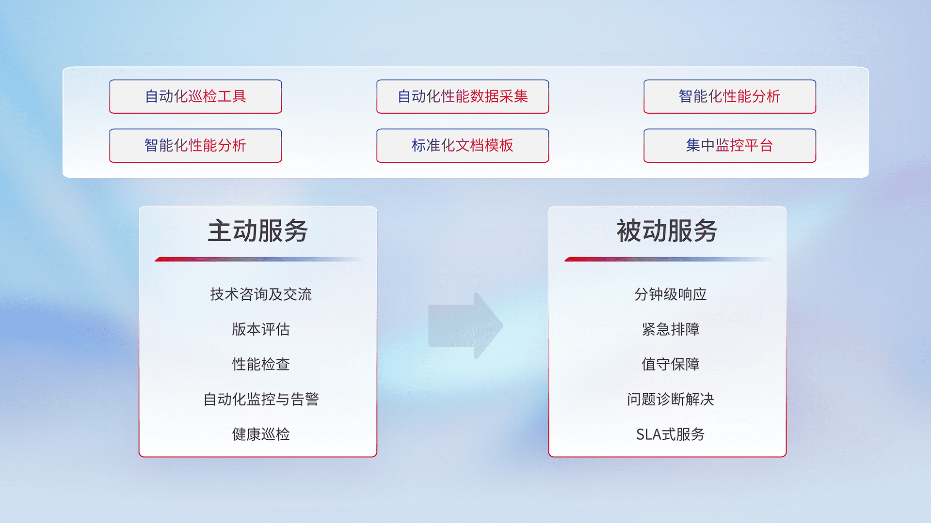 智能化工具和标准化文档,,保障服务质量,,提供主动服务(包含技术咨询、、、、版本评估、、、、性能检查、、、自动化监控与告警、、健康巡检)和被动服务包含(分钟级响应、、、紧急排障、、、值守保障、、、、问题诊断解决、、、SLA服务)。。